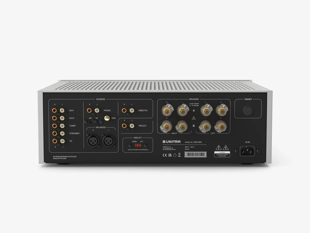 The Unitra WSH-805 Classic Edition is a refined reinterpretation of a flagship dual-mono integrated stereo amplifier, inspired by the golden age of 1970s hi-fi. This updated version retains the same proven audio architecture as the original model, preserving its full sonic performance and carefully engineered signal path topology. Elegant wooden side panels and subtle brass accents emphasize its timeless, vintage character while adding a sense of craftsmanship and warmth. Handcrafted with meticulous attention to detail, it seamlessly blends classic aesthetics with modern audio engineering. The result is an amplifier designed to appeal to listeners who value both authentic sound quality and enduring visual design.