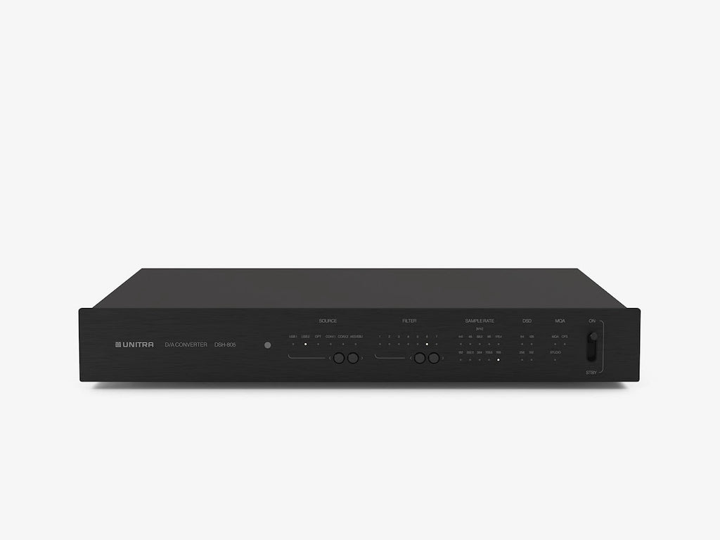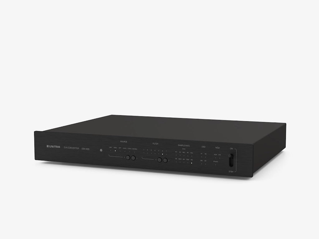 The Unitra DSH-805 is a reference level digital to analog converter created to fully realize the capabilities of today’s high resolution digital sources. At its core is the latest ESS SABRE® architecture, refined with Unitra’s proprietary solutions to achieve outstanding detail, ultra low noise, and exceptional conversion accuracy. Careful attention to signal path purity ensures a clean, all digital to analog process that preserves musical nuance and dynamic expression. From subtle micro details to powerful transients, the presentation remains natural, balanced, and engaging. The result is a spacious, lifelike soundstage with confident bass, smooth extended highs, and consistent performance across all listening conditions.